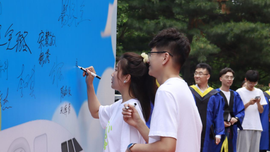 红毯两侧掌声响起,身着学士服的毕业生们映入眼帘,他们有的成双成对、有的搭了起人桥。他们在签字墙上留下自己的名字,等待着伴侣送上鲜花,向站在两侧的老师、同学挥手告别,仪式感满满。这条重温“大学成长路”的红毯如同回家之路,连接着同学们与老师的回忆与过往。