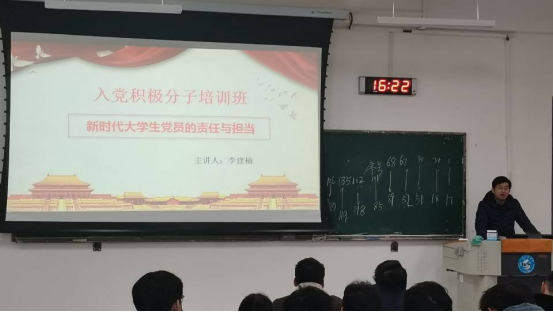 开班仪式后,beat365在线体育官网登录入口党委副书记兼副院长李建楠讲述了《新时代大学生党员的责任与担当》。他指出新时代对党员提出了四个方面新要求:一是要提高政治站位,把握时代大势;二是要有责任担当,完成新时代赋予的使命;三是要实干奋进,积极作为;四是要做到“四讲四有”,争做合格党员。全体学员更应顺势而为,因时而变,积极承担起新职责和新任务,紧密团结在以习近平同志为核心的党中央周围,立足本职、勤勉作为。