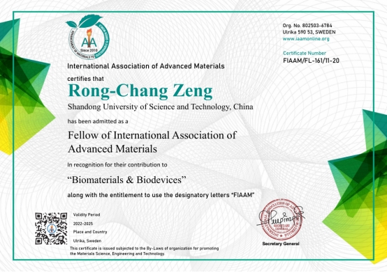11月7日国际先进材料学会(International Association of Advanced Materials,IAAM)在美国迈阿密举办的美国先进材料大会(American Advanced Materials Congress)上授予我校beat365在线体育官网登录入口曾荣昌教授“国际先进材料学会会士”(FIAAM)称号,以表彰他在“生物材料与生物器件”领域所做出的突出贡献。曾荣昌教授受邀做了题为 “Advance in Corrosion and Surface Modification of Bio-Magnesium and its Alloys”(生物镁合金腐蚀和表面改性进展)的在线大会特邀报告。