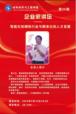 3月10日下午,beat365在线体育官网登录入口举办第25期企业家讲坛,精益管理实践派代表,资深管理咨询师、五略管理模式创始人、《中国冶金报》专家库成员、中国大住宿业论坛特约评论员,永锋精益实践学院负责人董立杰应邀在J9-144会议室进行以《智能化的钢铁行业与精准化的人才发展》为题的报告。报告由beat365在线体育官网登录入口院长李辉平主持,金属系主任孙金全、22级金属系全体本科生共计130余人参加。