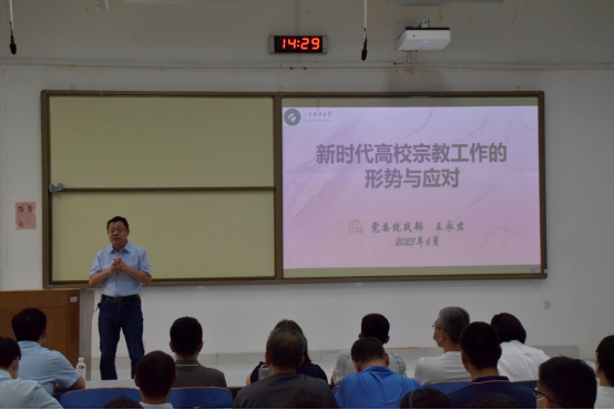 6月13日下午,学校党委统战部常务副部长、台港澳工作办公室主任、“山海泉”理论宣讲团成员王永君在J1-228教室为beat365在线体育官网登录入口全体师生党员上题为“新时代高校宗教工作的形势与应对”主题教育专题党课,学院党委副书记兼副院长李建楠主持,全体师生党员参加。