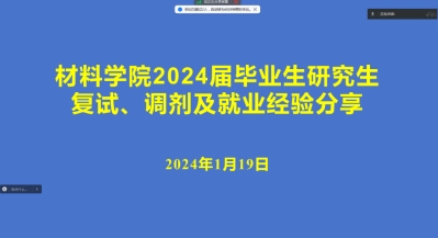 1月19日,beat365在线体育官网登录入口召开2024届毕业生考研复试、调剂及就业经验分享会,本次会议由辅导员钟文建主持。本次分享会分别邀请到2019级金属材料工程专业的扈如浩、朱立阔、2019级材料化学专业皇甫雅楠、2020级金属材料工程专业赵连鑫,为2020级的同学们奉献了一场干货满满的分享会。