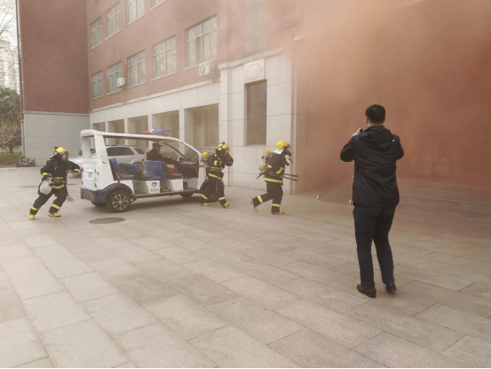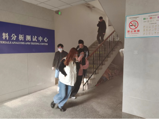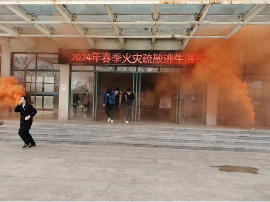 下午4点,火灾疏散逃生演练正式开始,工作人员点燃了烟雾弹,模拟真实火场。值班人员迅速排查起火点,拨打了火灾报警电话,应急疏散组老师在各楼层第一时间组织疏散教学楼内师生。全体师生按照疏散指令,以湿毛巾或衣物等捂住口鼻,按照逃生指示线路,靠右弯腰有序快速撤离,撤离到安全集合区域。消防工作人员迅速赶往火灾现场,连接水枪,及时扑灭了火情。