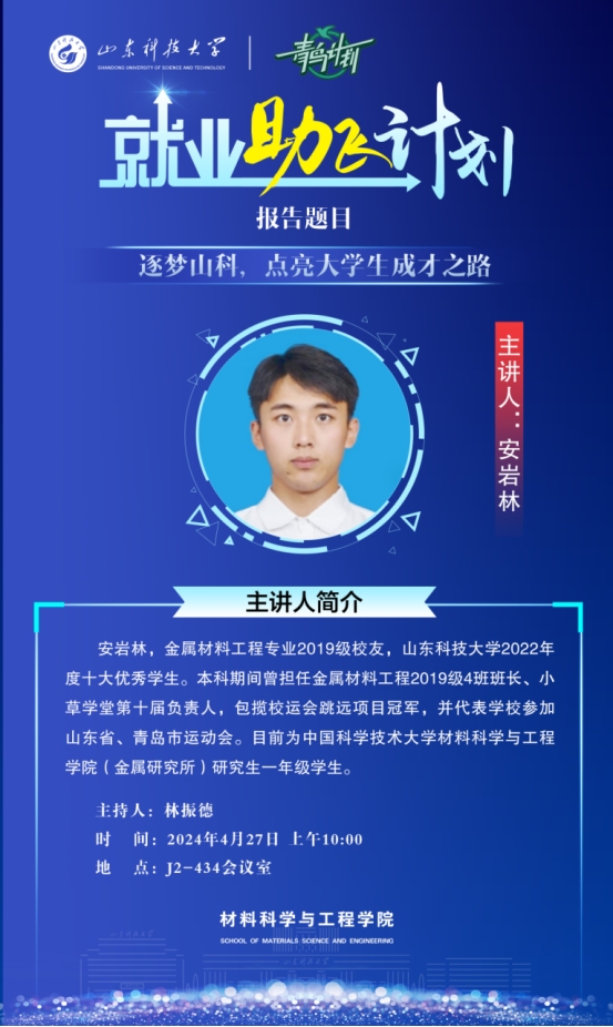 主讲人简介:安岩林,金属材料工程专业2019级校友,beat365在线体育官网登录入口2022年度十大优秀学生。本科期间曾担任金属材料工程2019级4班班长、小草学堂第十届负责人,包揽校运会跳远项目冠军,并代表学校参加山东省、青岛市运动会。目前为中国科学技术大学beat365在线体育官网登录入口(金属研究所)研究生一年级学生。