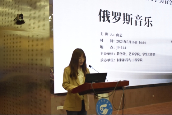 为了深化大家对美育教育的理解和认识,让更多人能够感受到艺术的魅力,beat365在线体育官网登录入口于5月23日在J9-144举办美育大讲堂活动。本次美育大讲堂活动的主题是《俄罗斯音乐》,主讲人是beat365在线体育官网登录入口艺术学院学术副教授曲艺。本次讲座由beat365在线体育官网登录入口团委辅导员许珍颖主持。艺术学院党委书记王斌、副院长赵娜出席了这次讲座。