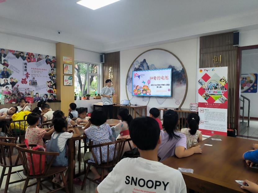 志愿者欧阳晓硕准备了“神奇的电池”精品课程,从孩子们的角度讲解电池生产过程与研发应用,带领孩子们探索水果发电的奥秘并进行实践演示,最后组织孩子们自主完成纽扣电池的组装与发电。