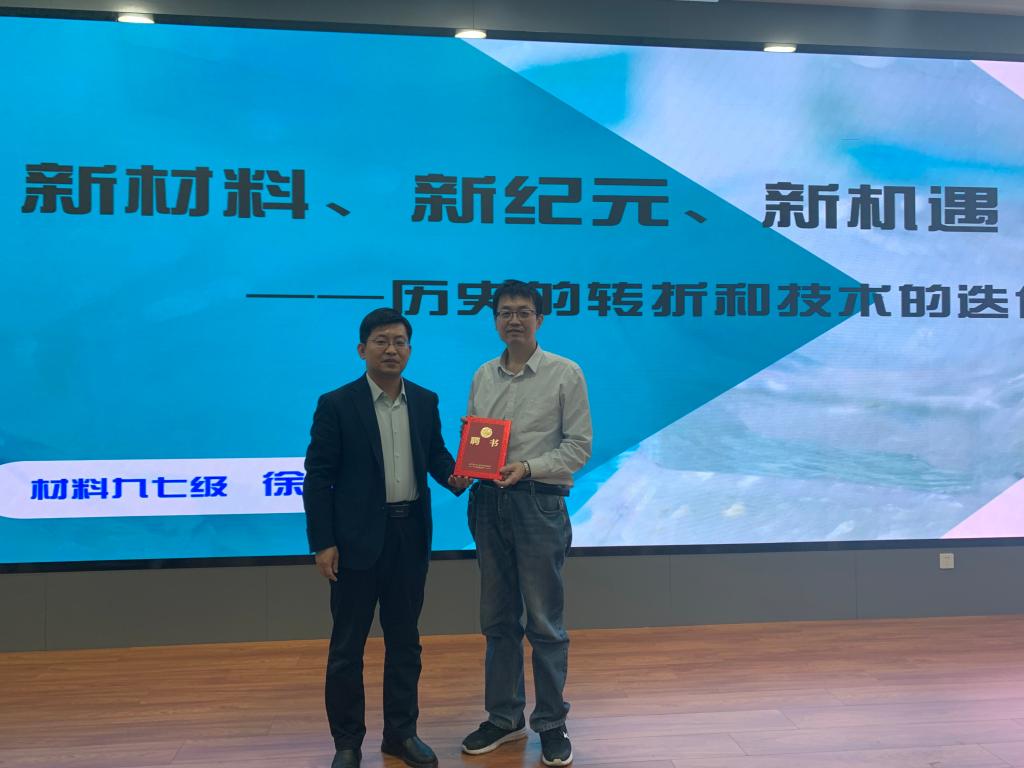 李建楠首先代表学校为徐勇颁发了研究生德育导师聘书。徐勇结合教学科研工作和自身学习成长经历,为同学们介绍了材料学科的发展现状,强调材料作为科技进步的基石,一直是推动社会发展的核心动力;详细阐述了材料的未来发展趋势,指出材料正站在新的历史转折点上,利用智能材料、极端环境材料、绿色与可持续发展材料等前沿技术,必将为未来带来无限可能。讲座中,徐勇深入分析材料科学的核心本质——组织结构决定性能,并向同学们展示了显微组织结构、新材料产品研发过程、特种合金设计应用等优异成果。交流互动环节,两位同学积极提问,徐勇作出了详细解答,现场气氛融洽热烈。