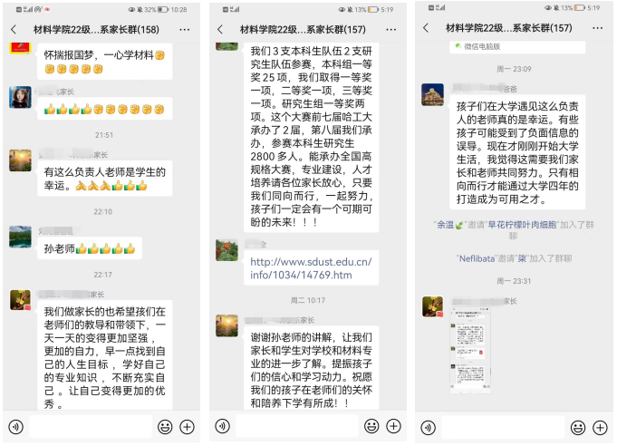 2022级新生入学以来,金属系积极开展家校联动,建立新生家长微信群及时与学生家长开展交流,随时反馈学生在校学习动态。金属系主任孙金全教授指出应该让更多的大学生家长积极主动地参与学校的教育教学活动,借助此次专业导论课让学生家长共同在线参与听课,实现了家校共育,开启了家长由“知会者”向“参与者”的探索与实践。学生家长在微信群内就课程内容展开了热烈讨论,充分肯定了课程内容,并点赞了学校采取的家校共育新举措。