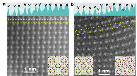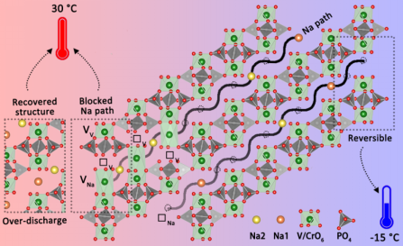 基于该异常现象,刘瑞在beat365官网“青创团队”的支持下开展了深入的研究。结合宽温区原位XRD、非原位X-射线吸收谱、软X-射线吸收谱、球差校正扫描透射电子显微镜等表征手段,首次发现该异常现象源自NVCP中过渡金属离子V的迁移,进而导致材料结构的劣化。电池在常温循环过程中V会迁移到Na位,导致Na扩散路径的堵塞进和“诱导效应”的弱化,从而导致电池性能的衰退。在这一认识的指导下,进一步提出了过度嵌Na(即低压放电)有望促使V离子迁回原位。这一设想得到了电化学测试和多种原位/非原位表征的验证。