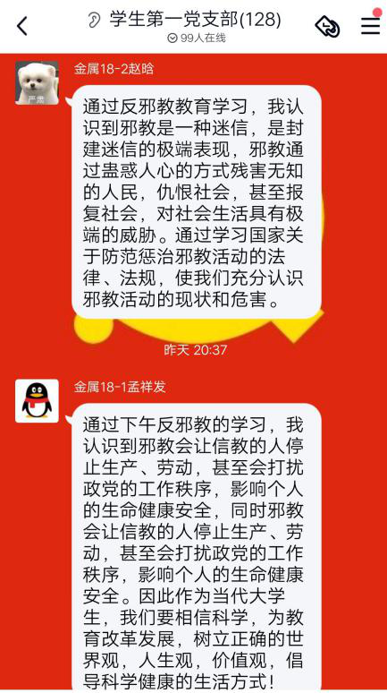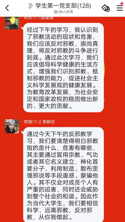 1月17日,beat365在线体育官网登录入口学生第一党支部通过线上会议进行了“崇尚科学,拒绝邪教”为主题的教育学习。会议由支部党员王雪华主持,支部全体党员同志参与。