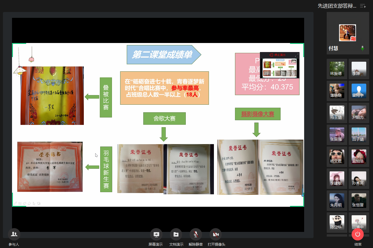 答辩过程中,各团支部分别从思想引领、支部建设、志愿服务、团内活动、社会实践与科技创新、青年大学习等方面进行了展示,展现了各团支部积极向上的精神风貌,反思了支部工作的不足,并展望了下一步的支部工作重点。