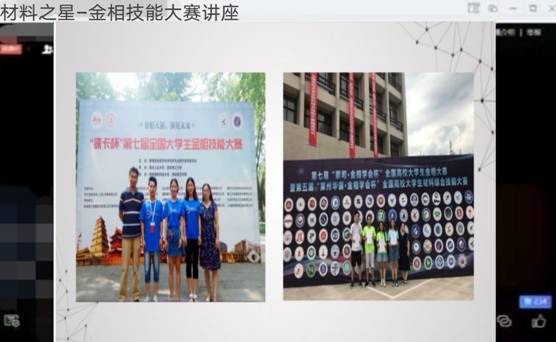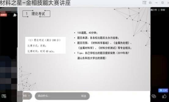 4月18日晚,beat365在线体育官网登录入口通过腾讯会议举办了材料之星金相技能大赛线上讲座。曾获全国高校大学生综合技能大赛特等奖的金属16-1班梁艳同学应邀分享了参赛心得和备赛方法,学院部分本科生同学参加。