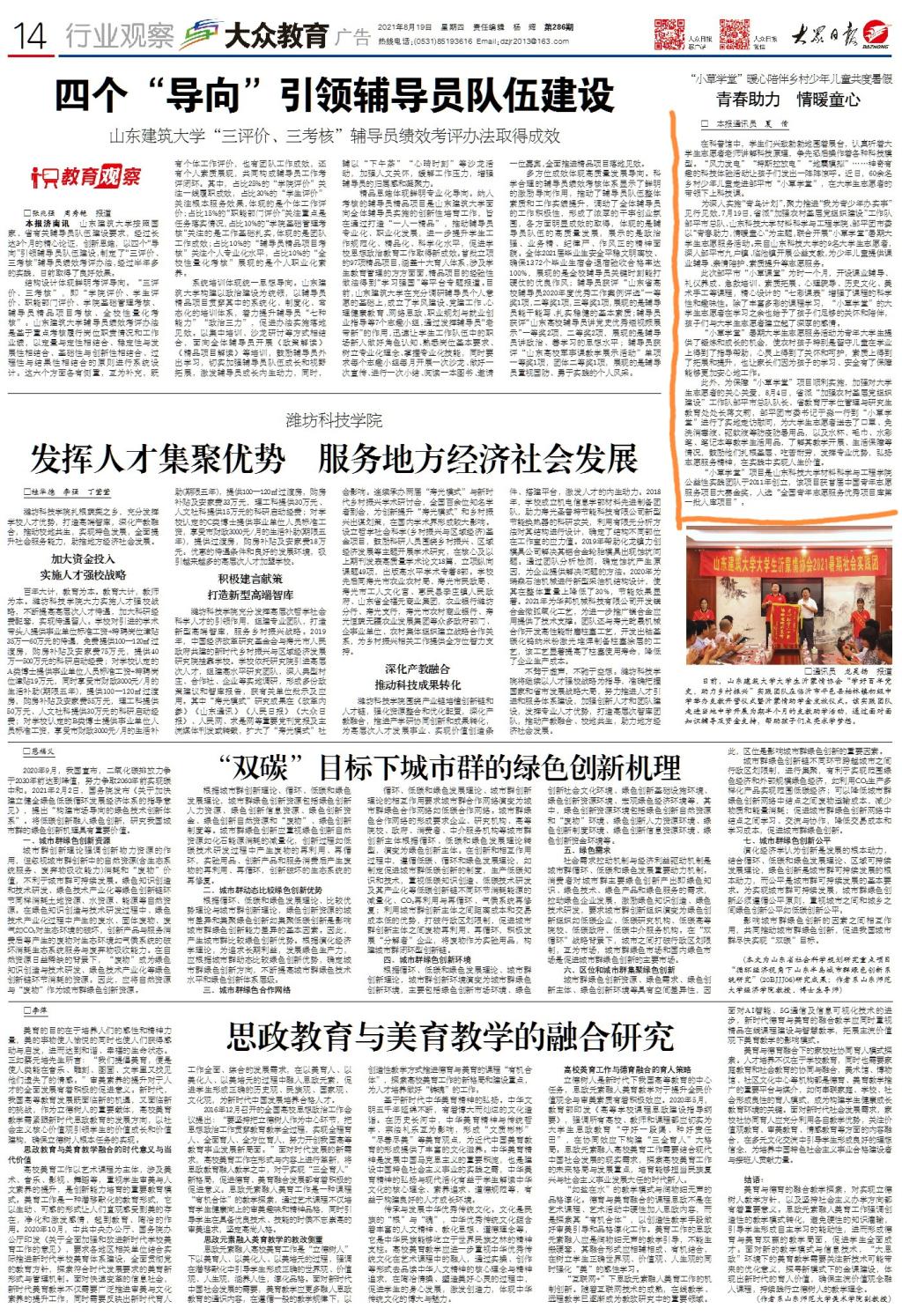 为助力乡村振兴,深入实施关爱农村留守儿童志愿服务项目和“情暖童心”关爱保护农村留守儿童工程,聚力推进“我为青少年办实事”见行见效,2021年暑期beat365在线体育官网登录入口小草学堂89名志愿者赴邹平市、东营市、日照市三地开展“小草学堂”暑期大学生志愿服务活动,深入开展公益支教,与700余名少年儿童一起共度欢乐暑假。期间,“小草学堂”实践团志愿服务活动被多家社会媒体宣传报道。