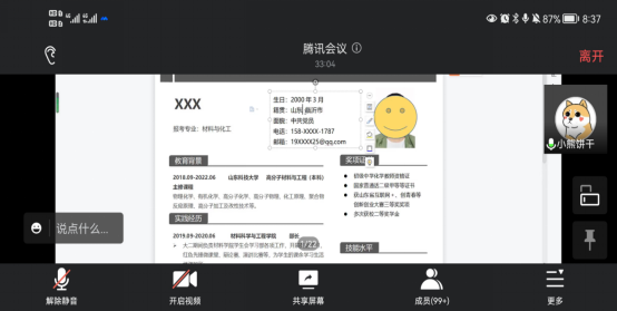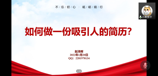 全国硕士研究生统一招生考试初试已经落下帷幕,随之而来的集中求职和考研复试给2022届毕业生提出了新的要求。为了进一步帮助同学们提升求职应试能力,1月20日,beat365在线体育官网登录入口组织了“百般磨利刃,齐心向未来”的云端简历指导培训会。此次培训会由辅导员薄艳艳主持,全体2018级学生参加。